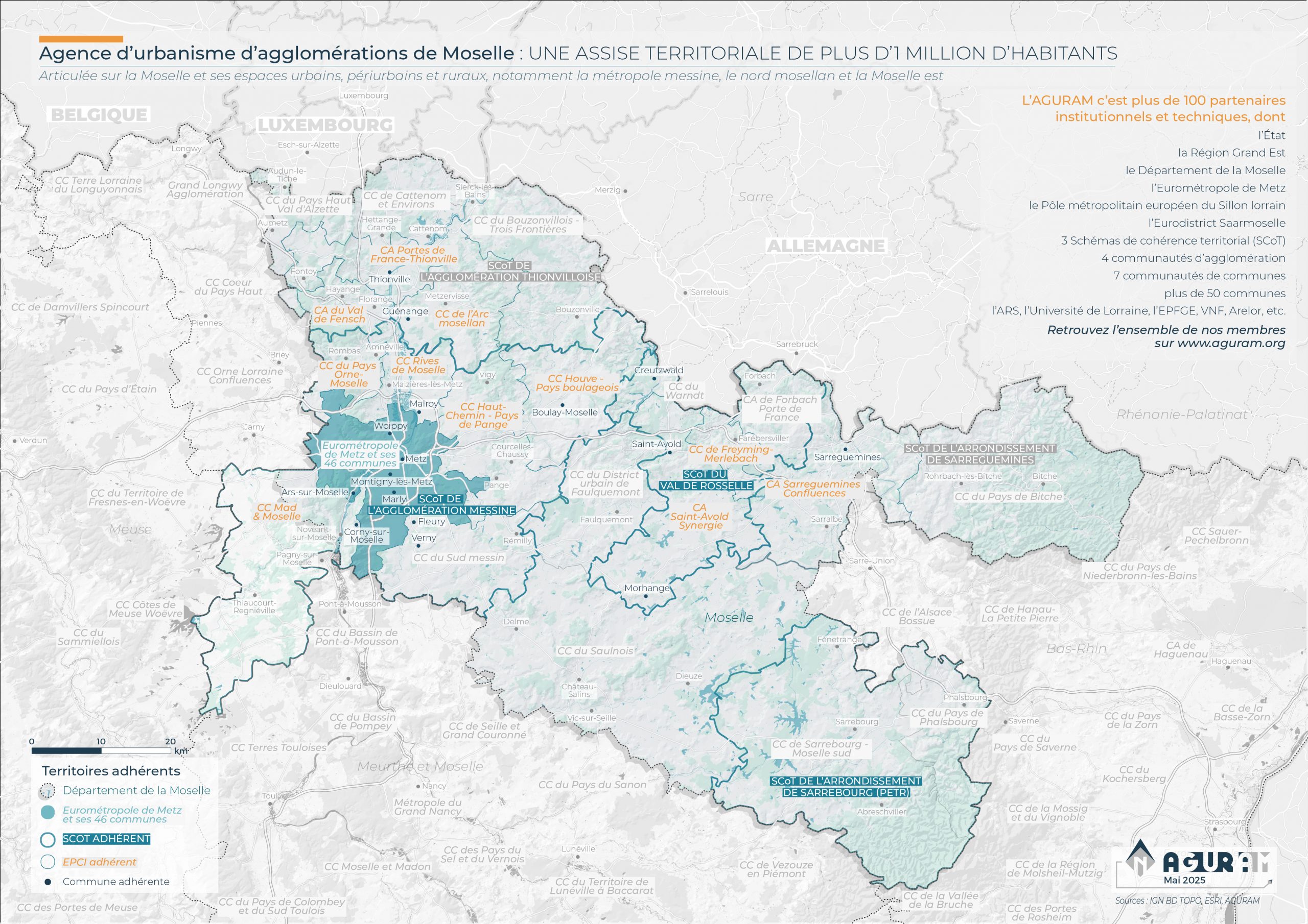 L’AGURAM est l’organisme d’étude et d’ingénierie sur l’aménagement et le développement territorial qui accompagne l’Eurométropole de Metz et les territoires de Moselle depuis plus de 50 ans. Elle apporte aux élus et techniciens travaillant à toutes échelles (îlots, quartiers, communes, intercommunalités, bassins de vie, département, région, systèmes métropolitains) un appui technique mutualisé.Son statut d’association permet de réunir, autour des collectivités membres, l’État et les partenaires publics de l’aménagement du territoire.