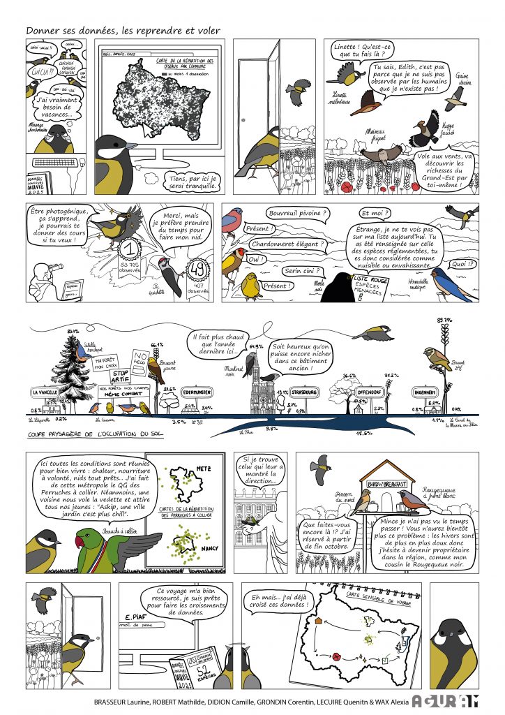 Nos experts ont pris ce challenge à cœur et ont proposé une BD poétique et humoristique appelée « Donner ses données, les reprendre et voler ». Ils en parlent : « Face aux nombreux biais qui influencent la base de données, nous n’avons pas trouvé pertinent de croiser les données dans leur globalité à l’échelle du Grand Est. Nous nous sommes donc focalisés sur des détails, des anecdotes et des coquilles sur lesquelles nous sommes tombés pendant notre analyse. Afin de construire une histoire courte et cohérente, nous avons fait le choix de nous concentrer uniquement sur les oiseaux. De plus, le format BD a permis d’ajouter une touche d’humour. » – Mathilde Robert, assistante d’études environnement et paysage ; Alexia Wax, chargée d’études projet urbain et observation ; Laurine BRASSEUR, cheffe de projet environnement, Camille DIDION, cartographe – géographe, Corentin GRONDIN, sigiste – infographiste et Quentin Lecuire, administrateur SIG – géomaticien.
