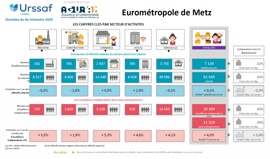 Au 4e trimestre 2025, dans la métropole messine : 7 134 entreprises employant 81 545 salariés et 19 194 travailleurs indépendants. Chaque trimestre, l’Urssaf Lorraine et l’AGURAM proposent un panorama de l’emploi dans l’Eurométropole à travers différents indicateurs. Nombre d’entreprises, de travailleurs indépendants, etc. : autant de données qui viennent alimenter les analyses économiques produites par l’agence, et qui donnent un aperçu de l’économie métropolitaine et de ses évolutions. Découvrez les derniers chiffres-clés.
