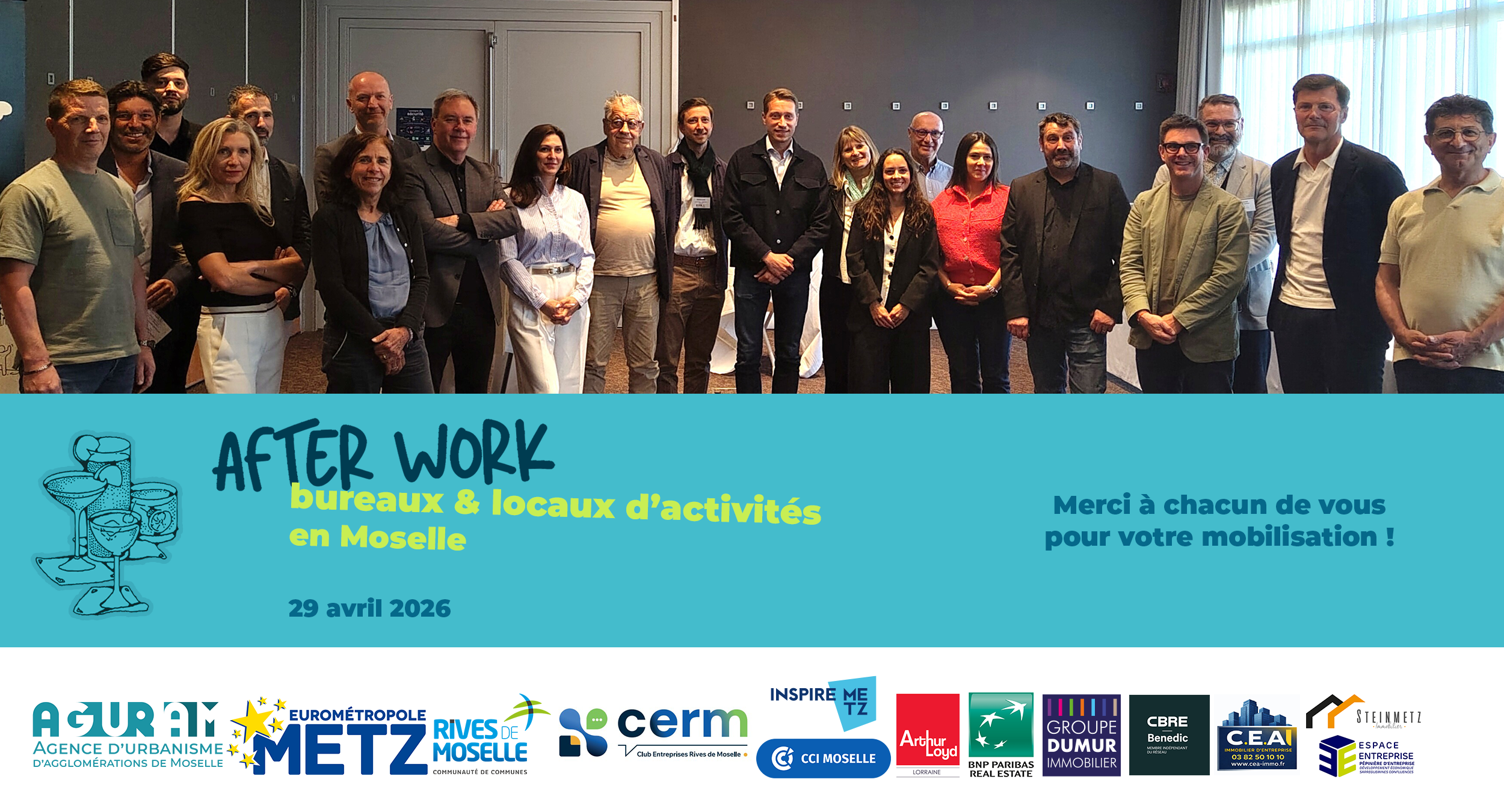 Un cocktail convivial permettra de prolonger les échanges. Animation par Jérôme Bergerot, directeur général de Moselle TV. Cet afterwork vous est proposé par le Club d’entreprises Rives de Moselle, l’Euro-métropole de Metz, la Communauté de communes Rives de Moselle et l’AGURAM, avec le partenariat d’Inspire Metz et de la CCI 57 et la collaboration des commercialisateurs locaux, dans le cadre de l’Observatoire de l’immobilier d’entreprises en Moselle.