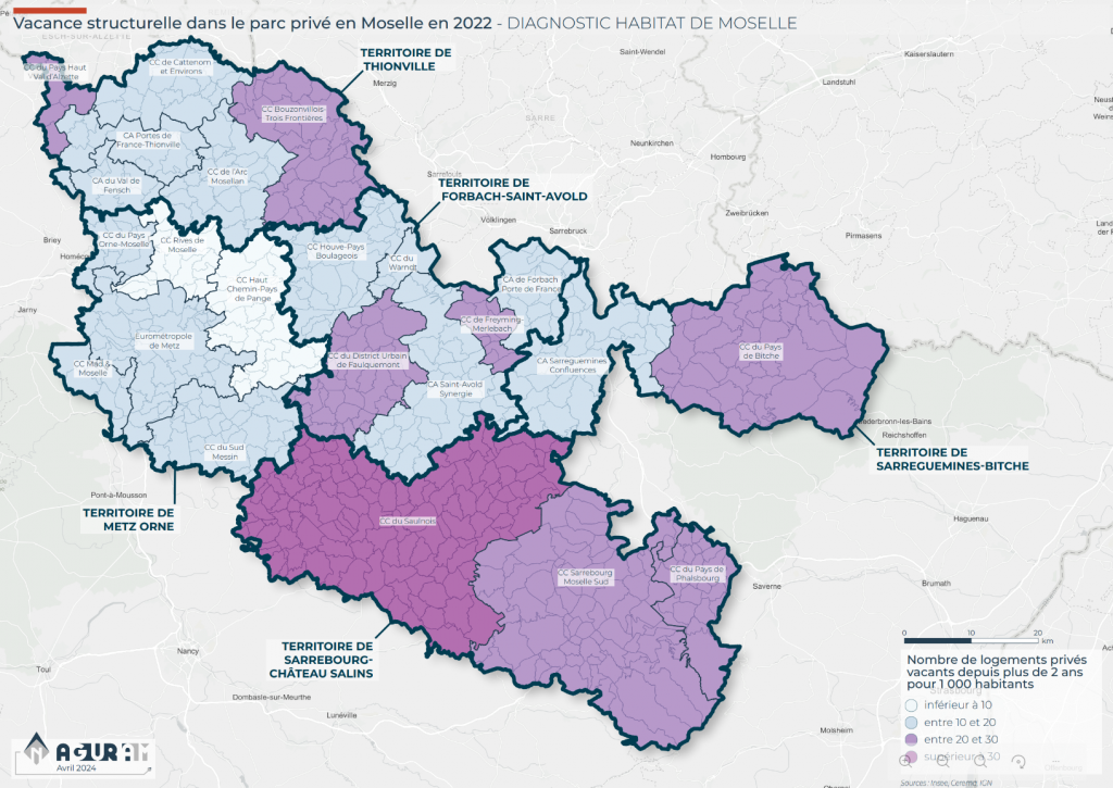 Depuis septembre 2023, le Conseil départemental de Moselle a souhaité s’engager dans une démarche volontaire en matière de politique du logement pour répondre aux besoins des territoires, dans leur diversité. Les agences d’urbanisme AGURAM et Agape ont été chargées d’élaborer un diagnostic afin d’identifier les enjeux d’habitat sur chacun des 5 bassins de vie (Forbach-Saint-Avold, Sarrebourg-Château-Salins, Sarreguemines-Bitche, Thionville et Metz-Orne). Sur cette base, un plan d’actions a été élaboré, adossé aux compétences en propre du département ainsi qu’à ses filiales et structures partenaires, pour en assurer la mise en œuvre autour d’une démarche concertée.